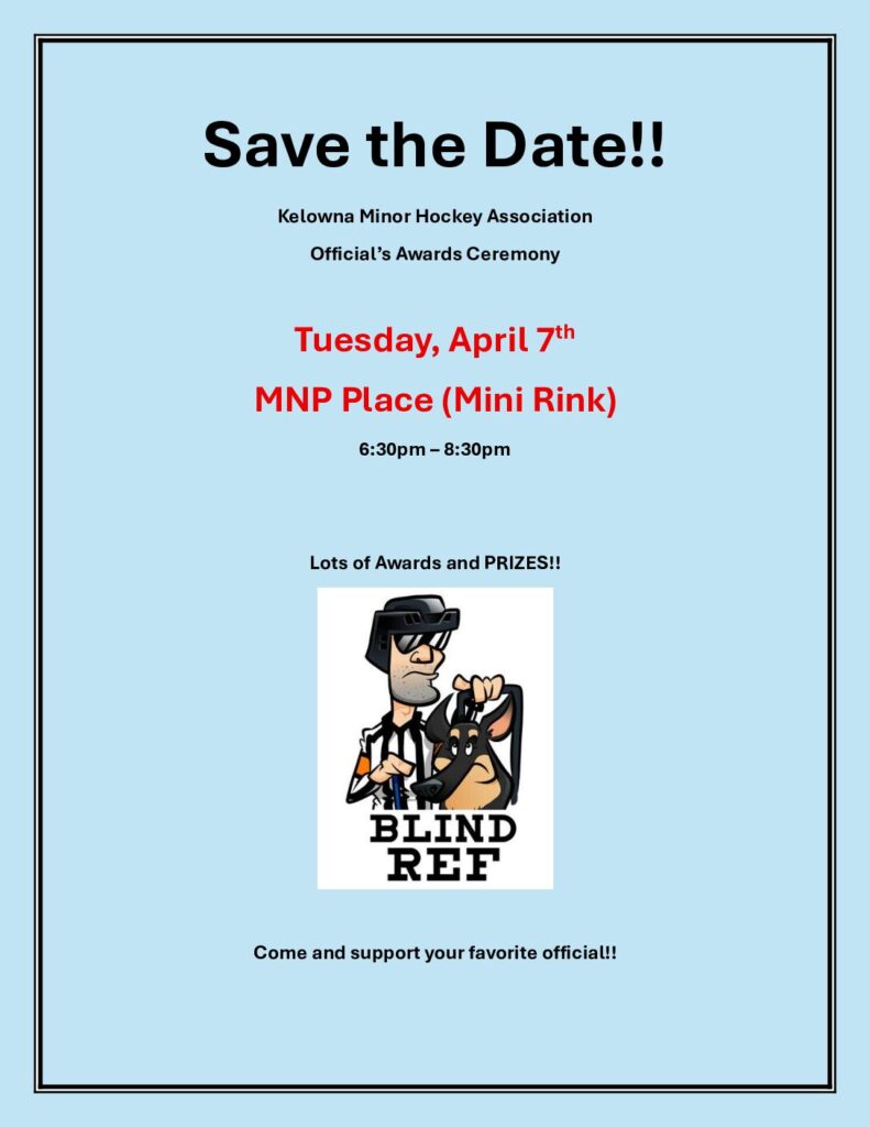 Come and support your favorite KMHA Officials on Tuesday April 7th. MNP Place Mini Rink will be hosting the fun event from 6:30-8:30 PM. There will be lots of awards, prizes and recognition for these very deserving Officials!